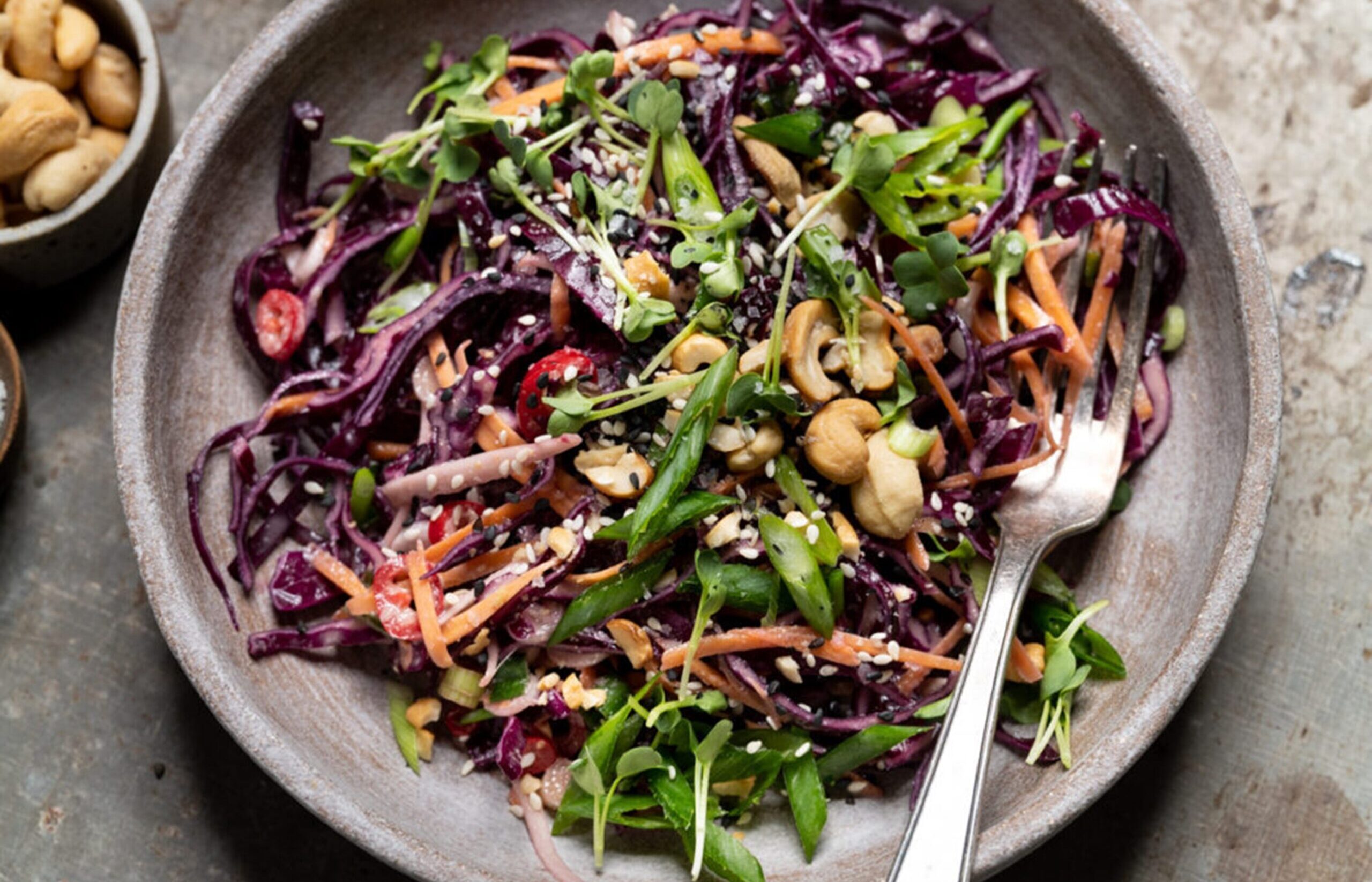 Sie lieben Kohl? Dann sollten Sie unbedingt diesen asiatischen Krautsalat ausprobieren, der nicht nur durch die leuchtende Farbe, sondern auch den Geschmack absolut überzeugt. Obendrein ist er auch noch ein richtiger Vitamin-K-Booster! Hier ist noch ein asiatisch inspirierter Salat.