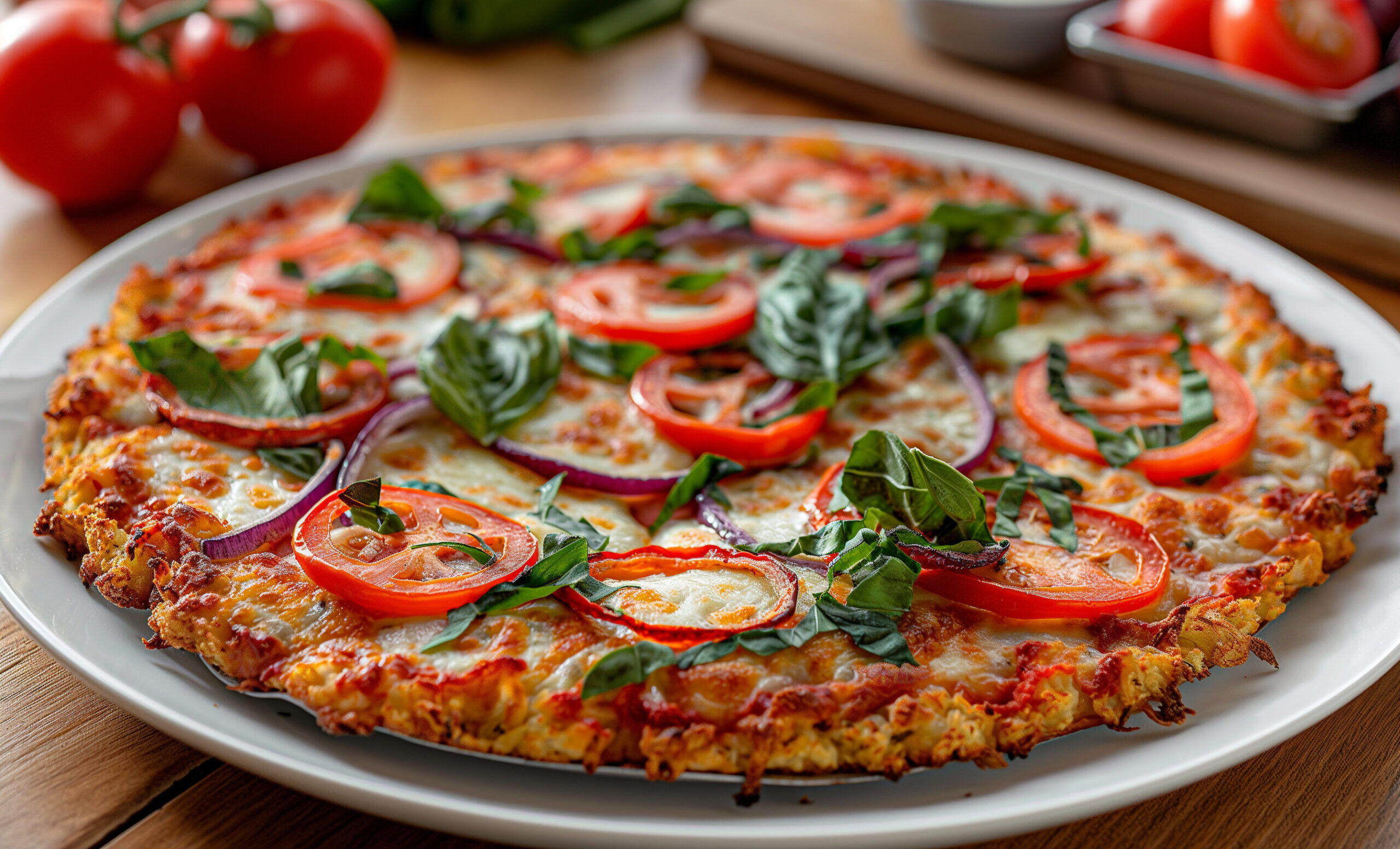 Sie wollen Pizza, aber Low Carb und ohne schlechtes Gewissen? Dann sollten Sie diese herzhafte Blumenkohlpizza mit grünem Pesto oben drauf probieren. Belegen Sie sie gerne mit Gemüse nach Wahl. Besonders gut schmecken darauf Zucchini, Champignons oder Aubergine. Hier ist noch eine Low-Carb-Alternative zu Pizza.