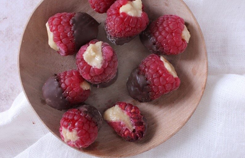 Diese kleinen gefüllten Himbeeren machen nicht nur optisch etwas her, sie schmecken einfach köstlich und sind ein gesunder Snack, der Ihnen eine geballte Ladung Antioxidantien in Form von Vitamin C, Vitamin E sowie Polyphenolen und Flavonoiden aus der dunklen Schokolade liefert. Statt mit Cashewmus können Sie die Himbeeren auch mit Mandelmus, Kürbiskernmus oder Pistazienmus füllen – der Kreativität sind hier keine Grenzen gesetzt! Hier ist noch ein Himbeer-Rezept.