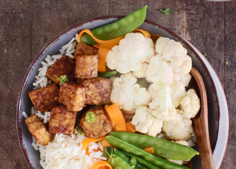 Tempeh gehört zu den eher wenig bekannten Fleischersatzprodukten, dabei ist er aufgrund des mild-nussigen Geschmacks und der festen Konsistenz vielseitig verwendbar. Außerdem ist er fettarm, reich an wertvollem Eiweiß und kann bei einer gehirngesunden Ernährung Demenzerkrankungen wie Alzheimer vorbeugen. Heute baden wir ihn in einer Marinade aus Sojasauce und geben ihm Reis und frisches Gemüse zur Seite. Als Nachtisch empfehlen wir unseren Orangen-Erdbeer-Smoothie.