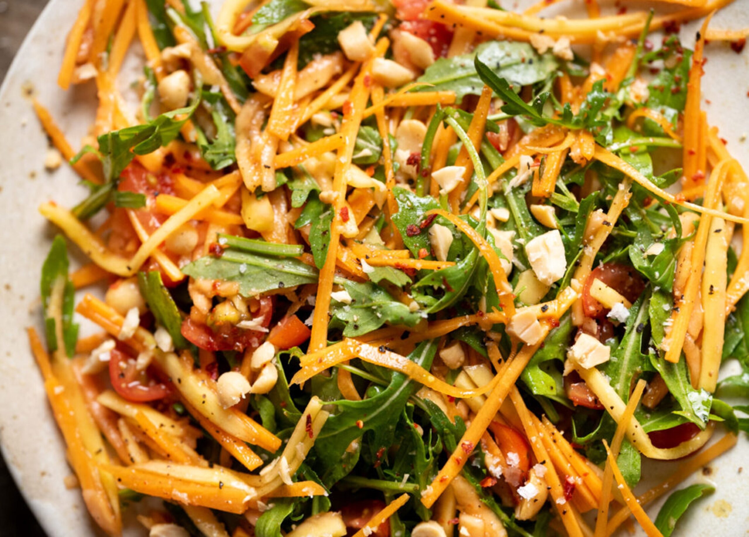 Es war wohl noch nie so einfach, die thailändische Küche zu sich nach Hause zu holen. Traditionell wird dieser Papaya-Salat mit einer grünen Papaya gemacht, aber auch die in Deutschland verbreitete orangene passt perfekt. Mit Chili, Erdnüssen, Karotten und Rucola wird daraus die perfekte Kombination aus süß, scharf, knackig und frisch. Noch einen asiatisch inspirierten Salat finden Sie hier.