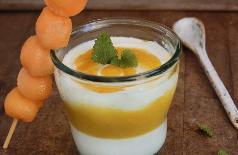 Quarkspeise mit Pfirsich und Honigmelonen-Spieß