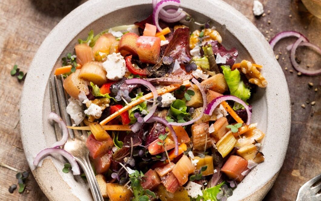 Rhabarber kennen Sie nur in Desserts oder als Marmelade? Dann müssen Sie unbedingt dieses herzhafte Salat-Rezept ausprobieren. Frühlingssalat trifft hier auf im Ofen gerösteten Rhabarber. Hier ist noch ein herzhaftes Rhabarber-Rezept.