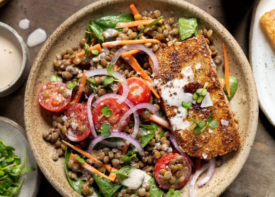 Dieses Linsengemüse ist auch ohne Fleisch ein guter Proteinlieferant für den Mittag oder den Abend. Dazu gibt es knusprig gebratenen Halloumi-Käse. Als Nachtisch empfehlen wir ein Nektarinen-Himbeer-Eis, das ohne Eismaschine superschnell fertig ist.